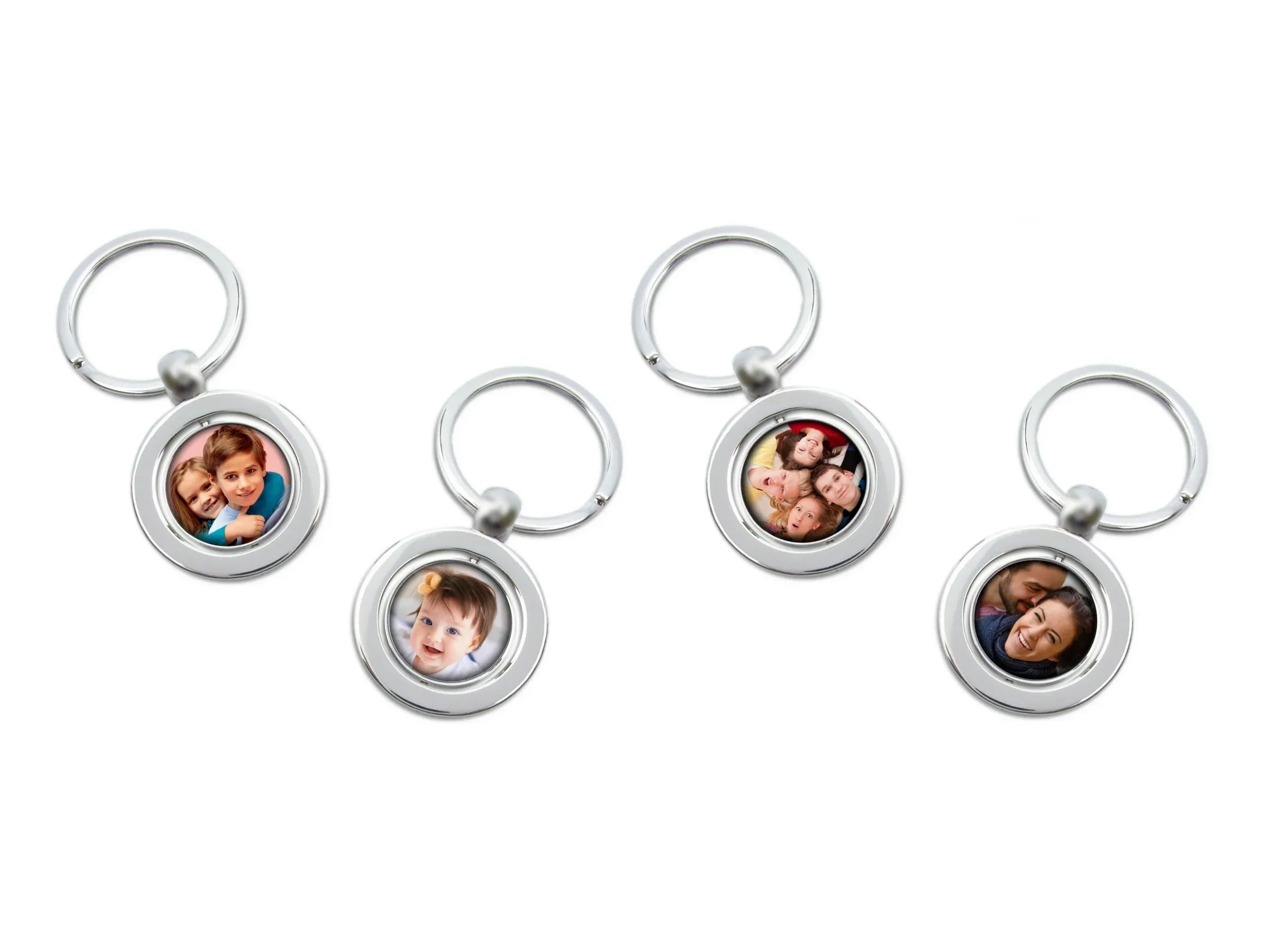 Mooi glanzend, zilverkleurige sleutelhanger waarvan op het middelste gedeelte uw persoonlijke foto wordt geplaatst. Dit middelste gedeelte draait om zijn as (achterzijde is glanzend zonder bewerkingen) – materiaal van deze sleutelhanger is edelstaal en voelt zwaar aan. De stevige ring biedt voldoende ruimte voor meerdere sleutels.